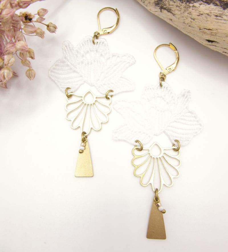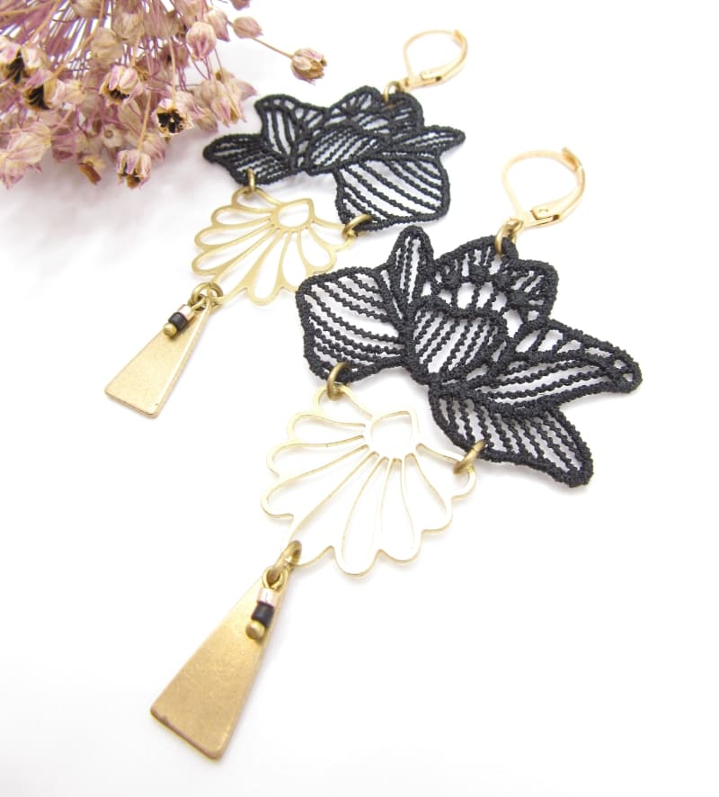 Boucles d’oreilles fleuries dentelle et laiton pacotilles-création